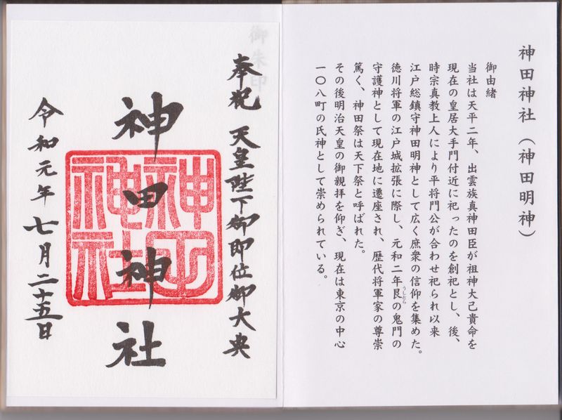 神田神社は社伝によれば、天平2年(730年)に出雲族の真神田臣が祖神大己貴命を現在の皇居大手門付近に祀ったのを創祀としています。以来、江戸総鎮守の神田明神として広く庶衆の信仰を集めました。
